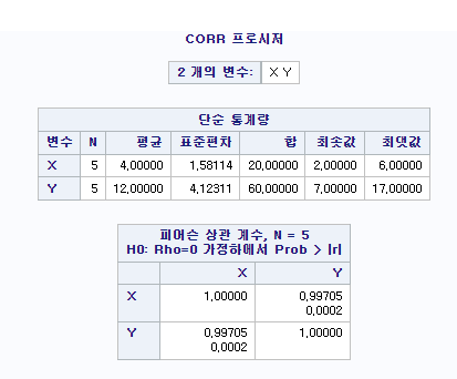 다음 예제는 PROC CORR을 사용하여서 두 개 변수의 상관 계수를 계산한다.