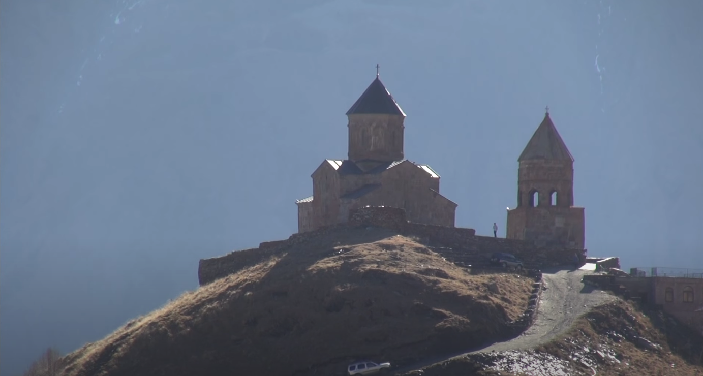 프로메테우스의 신화가 깃든 카즈베기 산(해발 5470m)을 배경으로 요새처럼 산꼭대기에 자리 잡은 이 수도원에 서면 코카서스 산맥의 신령한 분위기에 압도되어 누구나 순례자의 기분을 느끼게 된다.