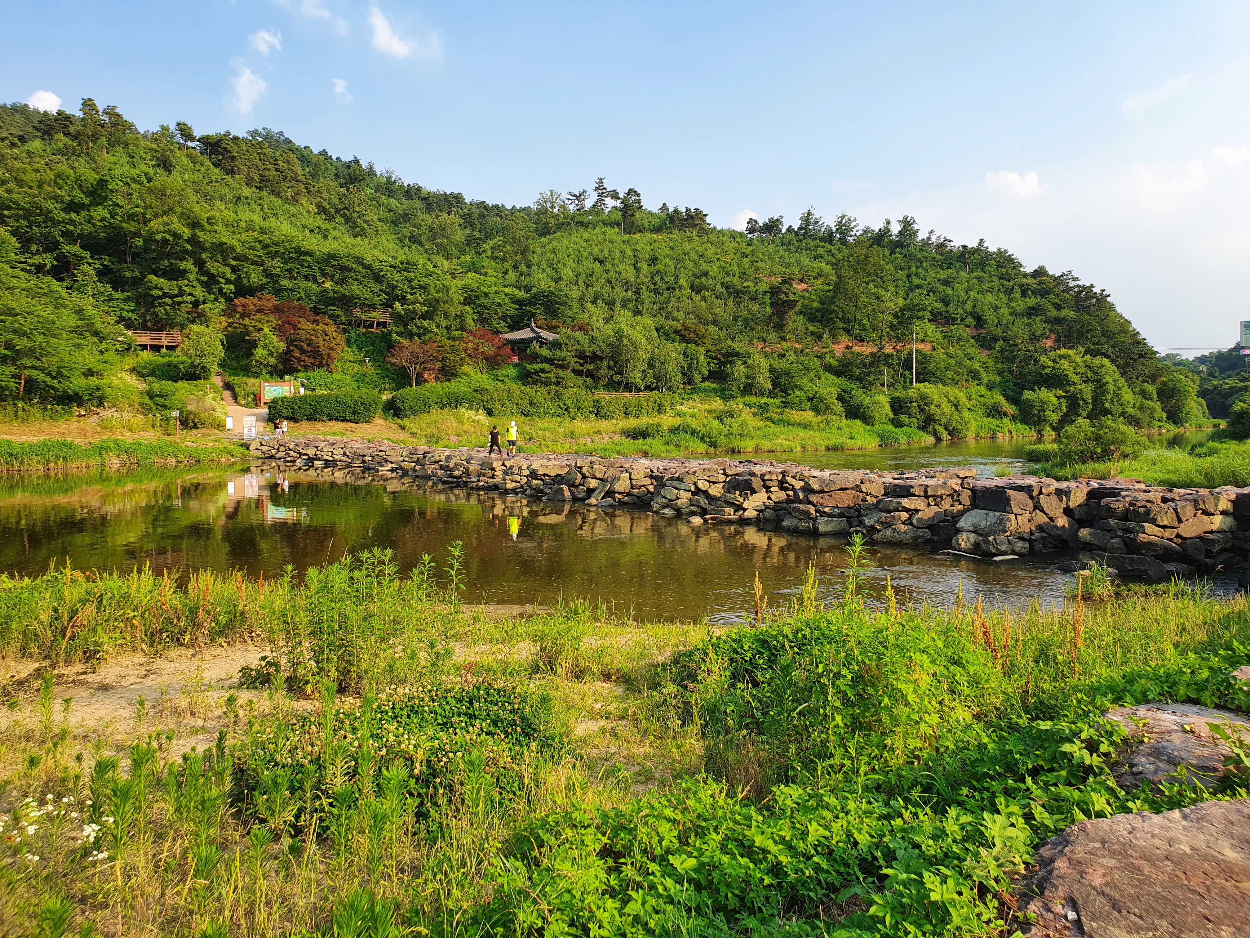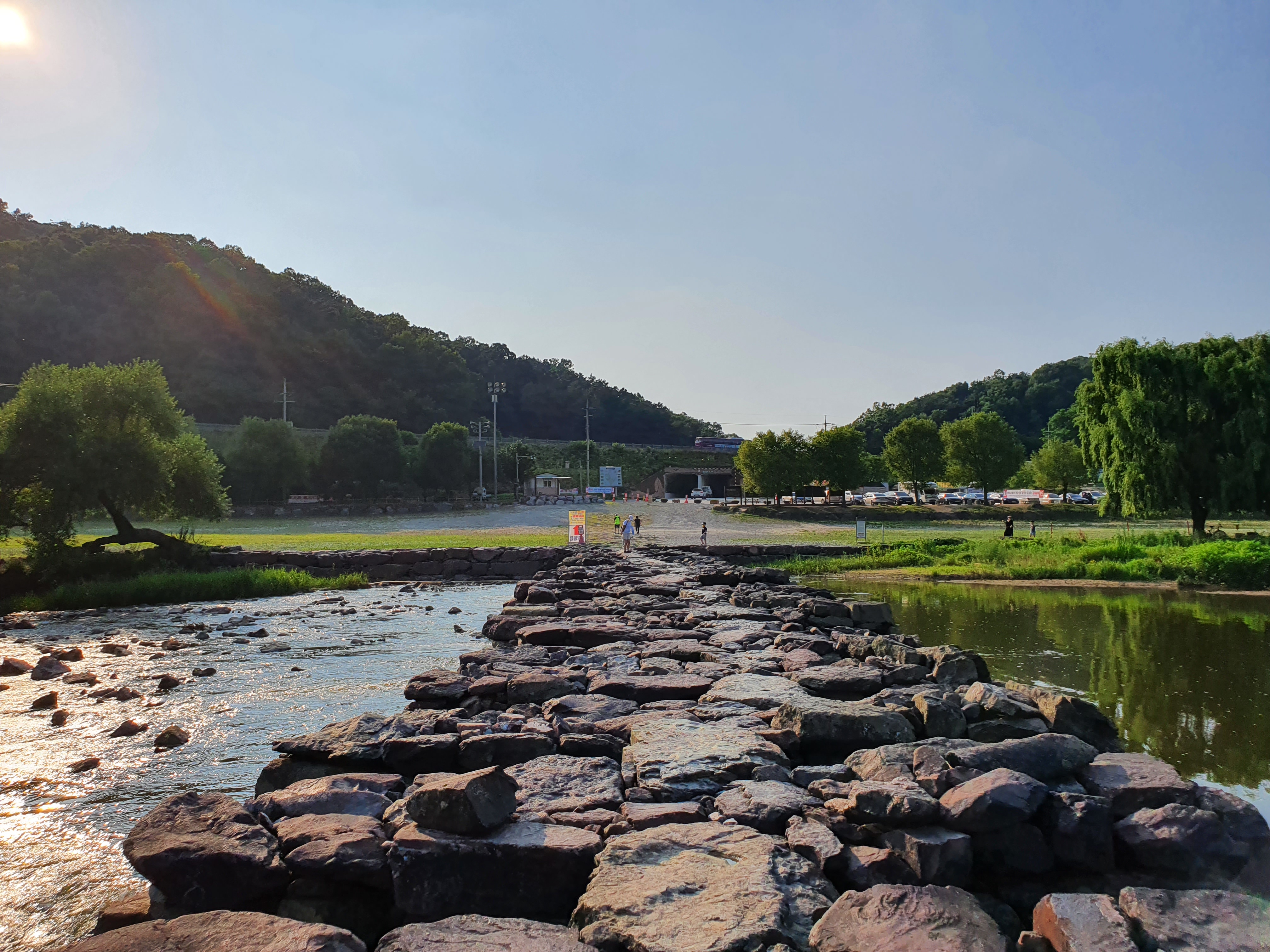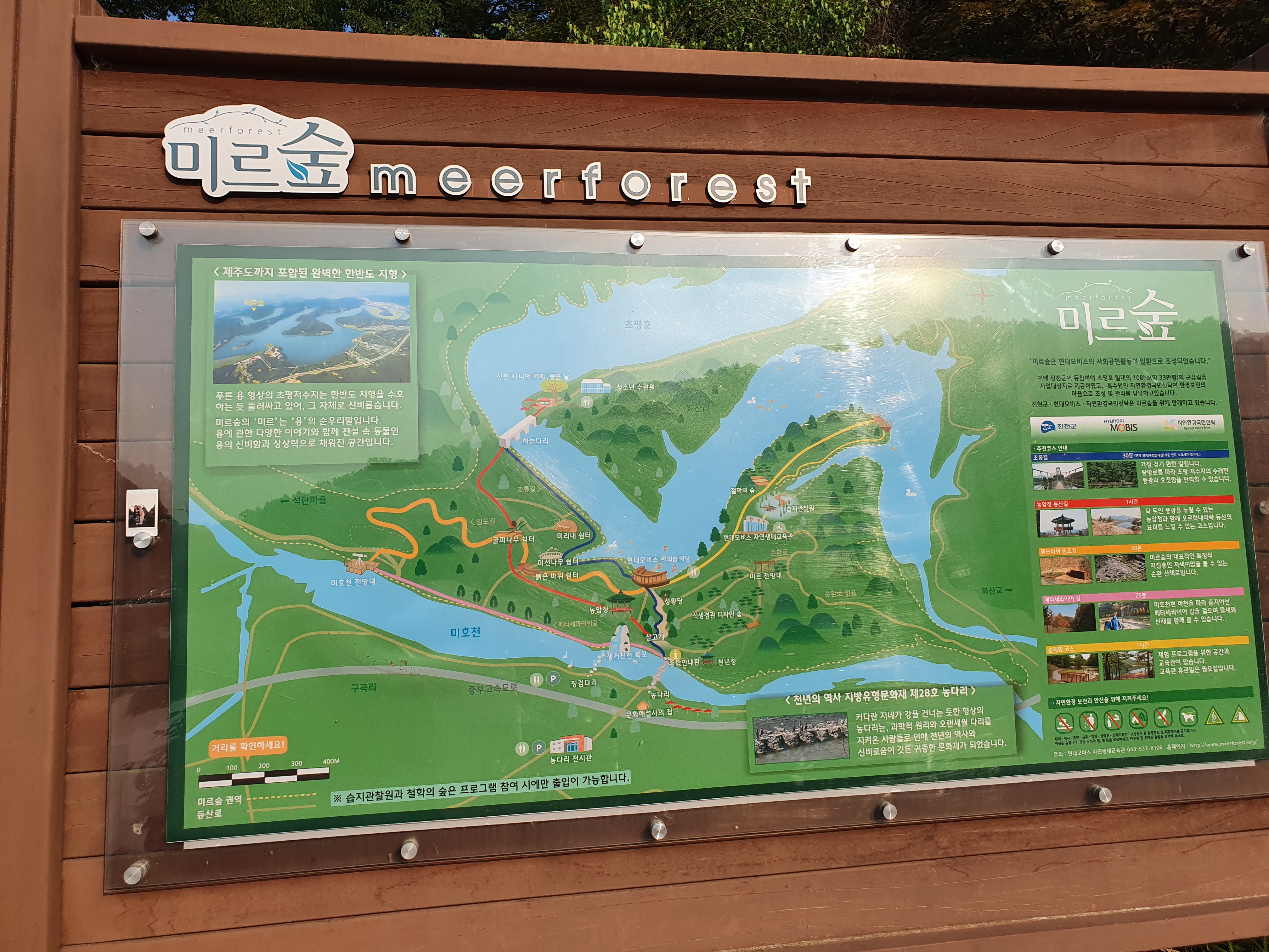 현대모비스 사회사업 지원으로 주변이 잘 정리가 되어 있어서 가족 산책하기 좋음. 주말 저녁이라서 사람도 드물고 한적하게 1~2시간 거닐기 좋은 코스(농다리-현대모비스 야외음악당-초평호 하늘다리 코스).