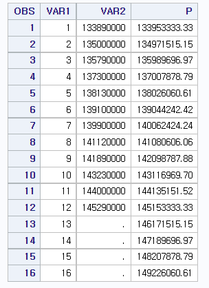 다음 예제는 PROC REG를 사용하여서 VAR1 변수의 13 이후 값에 해당하는 VAR2 변수의 선형 추세 예측 값을 반환한다.