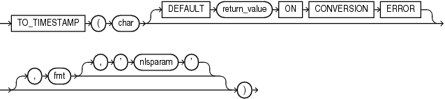 사용자가 선택적으로 지정하는 옵션 DEFAULT return_value ON CONVERSION ERROR 절을 사용하여 char 인수를 TIMESTAMP 형식으로 변환하는 동안 오류가 발생하는 경우 이 함수에서 반환되는 값을 지정할 수 있다. char 인수를 평가하는 동안 오류가 발생하면 이 구절은 아무런 영향을 미치지 않는다. return_value는 표현식 또는 바인드 변수일 수 있으며, CHAR, VARCHAR2, NCHAR 또는 NVARCHAR2 데이터 타입의 문자열 또는 NULL로 평가되어야 한다. 이 함수는 char 인수를 TIMESTAMP 형식으로 변환할 때와 동일한 방법을 사용하여 return_value 를 TIMESTAMP 형식으로 변환한다. return_value를 TIMESTAMP 형식으로 변환할 수 없는 경우 에러를 반환한다.
