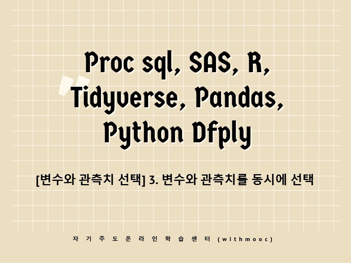 | 통계프로그램 비교 목록(Proc sql, SAS, SPSS, R 프로그래밍, R Tidyverse, Python Pandas, Python Dfply) |