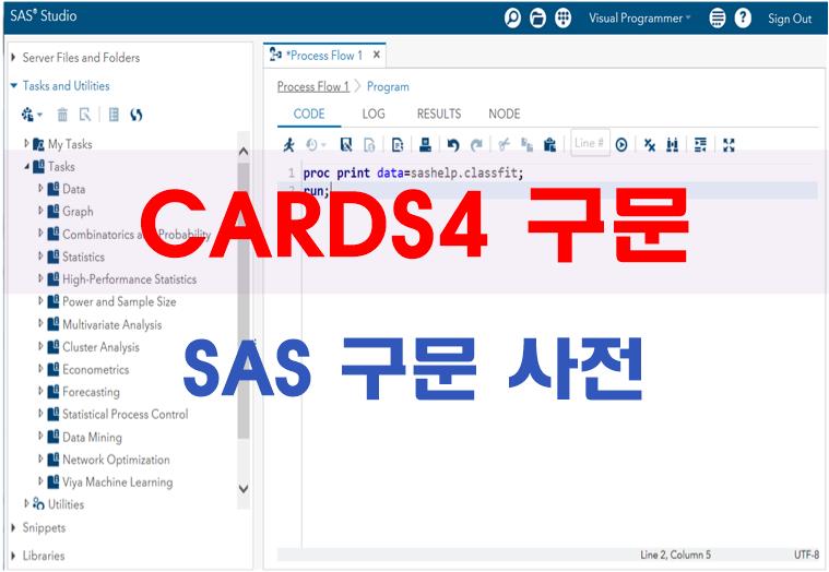 CARDS4 구문은 프로그램 내부에서 세미콜론(;)이 포함된 데이터에 대한 입력 작업을 수행하기 위하여 데이터 입력 라인의 시작을 선언한다. CARDS4 구문에 대한 변수의 정의는 INPUT 구문을 사용한다.