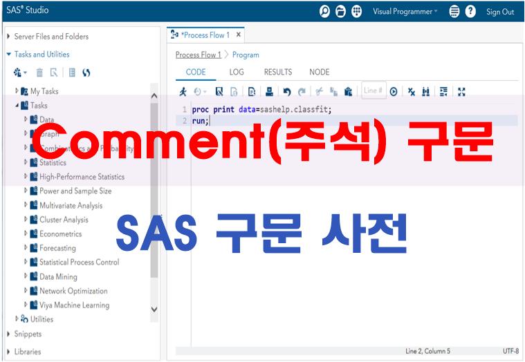 Comment(주석) 구문은 SAS 프로그램을 효율적으로 관리하기 위하여는 세부 프로그램에 대한 주석을 작성하는 것이 좋은데, 주석 구문을 통하여 프로그램 목적, 예외 사항, 복잡한 프로그램이나 계산식에 대한 설명 등을 작성하면 향후에 프로그램에 대한 관리가 편리하다. SAS는 주석문 안에 위치하는 텍스트 구문을 실행하지 않는다.