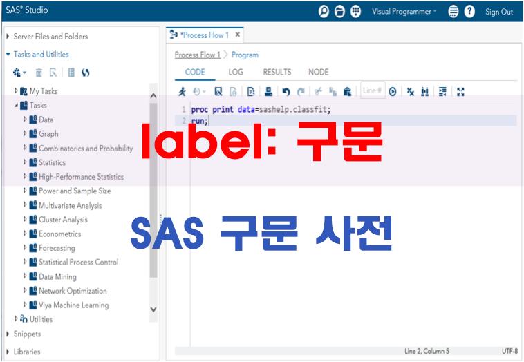 - LABEL 구문은 변수에 설명 레이블을 지정한다. 구문레이블은 동일한 데이터 스텝의 다른 구문(GOTO 구문, LINK 구문 등)에서 참조되는 SAS 구문 또는 SAS구문으로 구성된 그룹의 위치를 표시한다.