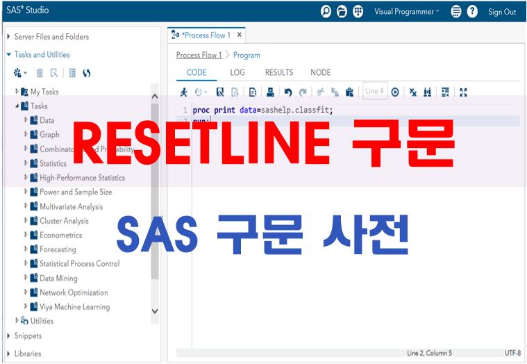 RESETLINE 구문은 SAS 로그의 프로그램 행 번호를 1로 초기화한다. 기본적으로 SAS 로그에는 행 번호가 출력되는데, 1에서 시작하여서 프로그램이 종료될 때까지 순차적으로 +1씩 증가하여 지정된다. 프로그램에서 RESETLINE 구문을 지정하여서 행 번호를 다시 1로 재설정할 수 있다.