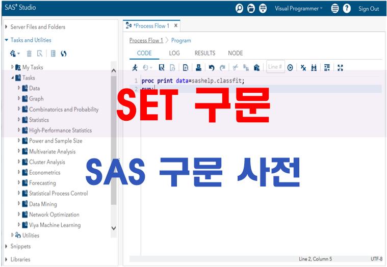 SET 구문은 하나 이상의 SAS 데이터 세트에서 관측치를 읽는다. SET 구문이 실행되면 SAS는 프로그램 데이터 벡터(PDV)에 하나의 관측치를 반복하여 읽는데, 만약 다른 명령을 지시하지 않은 경우에 SET 구문은 입력 데이터세트의 모든 변수와 모든 관측치를 읽는다. SET 구문에는 다수의 데이터 세트를 포함할 수 있고, 또한 데이터 스텝에 다수의 SET 구문을 포함할 수 있다.