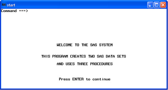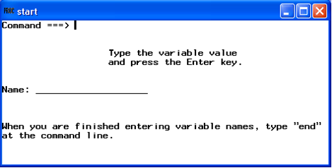 START 윈도우는 전체 모니터 화면을 채운다. 텍스트의 첫 번째 라인의 색은 검정색이고, 다른 3개의 라인은 운영환경의 기본색이 지정된다. 텍스트는 프로그램에서 지정된 열에서 시작한다. START 윈도우는 값의 입력을 요구하지 않는다. 그러나, 윈도우를 나가기 위하여 다음 중에 하나의 방법을 사용해야 한다.