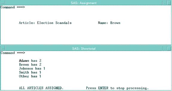 할당 윈도우에서(모니터 상단에 위치한), 기사의 이름과 기자의 이름을 입력하는 필드가 보인다. 이름을 입력하고 ENTER키를 누른 후에, SAS는 각각의 리포터에게 할당되는 기사의 개수(바로 할당한 기사를 포함한)를 보여주는 Showtotal윈도우(모니터 하단에 있는)를 표시한다. 할당을 계속하기 때문에, Showtotal 윈도우의 값은 갱신된다. 데이터 스텝의 마지막 반복 후에, SAS는 모든 기사가 할당되었다는 메시지와 처리를 중지하기 위하여 ENTER키를 누르라는 메시지를 표시한다.