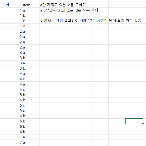 - 방법2 : SQL을 사용하여서 ID변수를 기준으로 item변수의 항목이 1개이면서 'a' 인 관측치 항목을 선택
